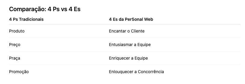 Essa releitura coloca o cliente, a equipe e a diferenciação competitiva no centro da estratégia. Neste artigo, você vai entender como os 4 Es aplicados pela Per5onal Web substituem e ampliam os 4 Ps tradicionais, oferecendo uma metodologia prática e exclusiva.